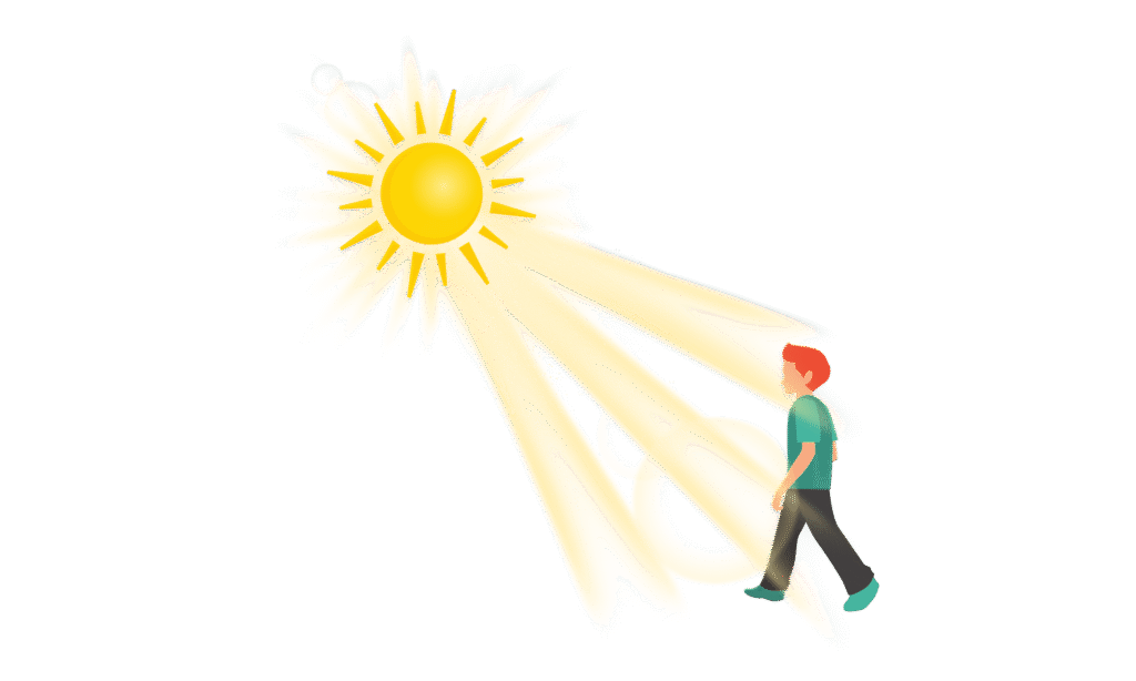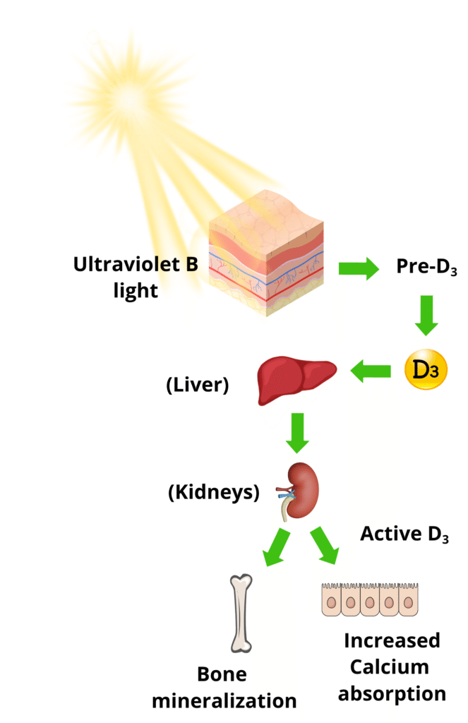 Sunlight (that includes Ultraviolet B light) shines on the skin and triggers the cells in our body to start the first step of Vitamin D “synthesis”.